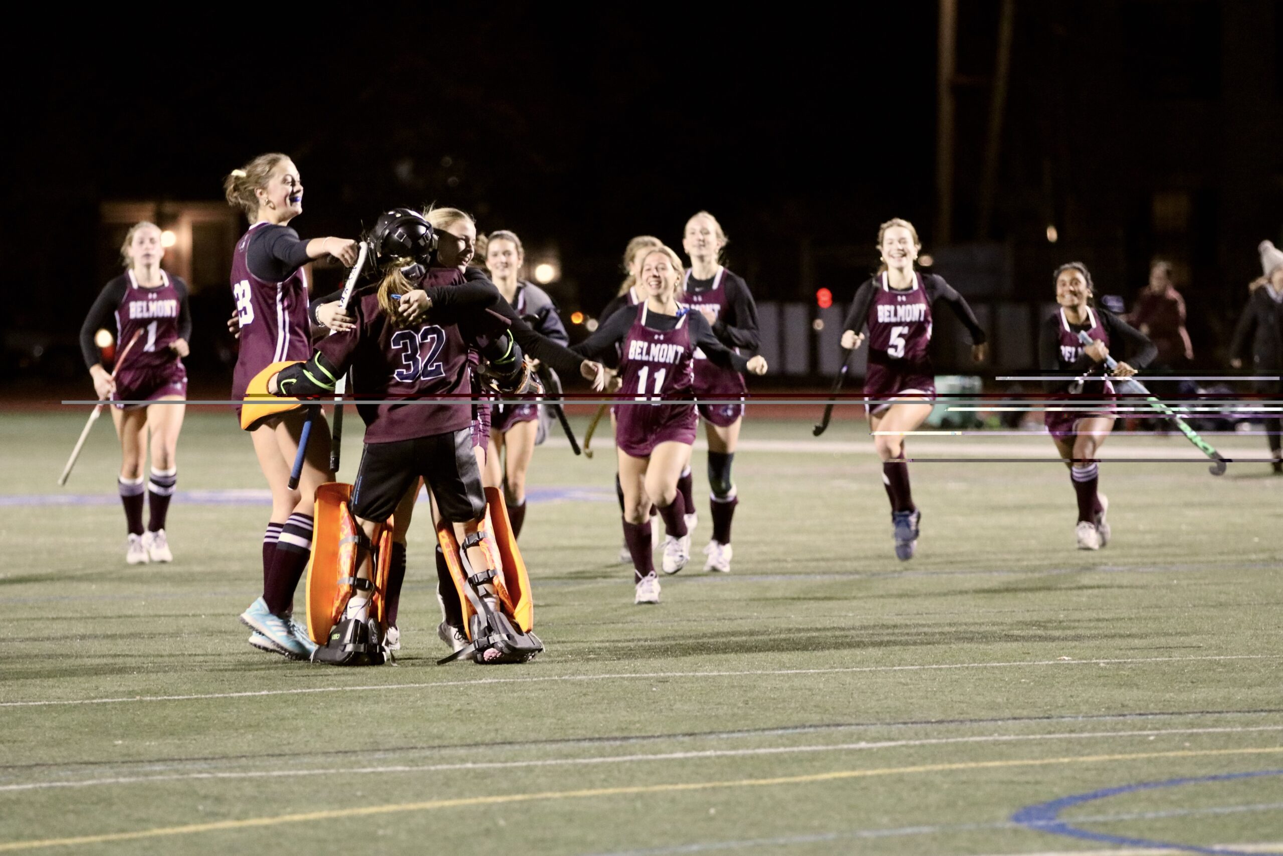 Photo: Belmont High run to celebrate with sophomore goalie Zoe Bruce after shutting out Wachusett Regional, 4-0, in the Sweet 16 of the MIAA Div. 1 Field Hockey tournament.